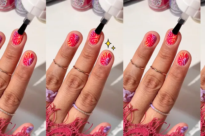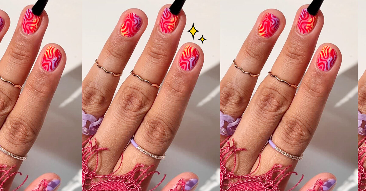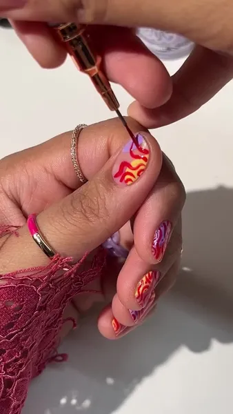 - Окуни чистую тонкую кисть в красный лак и поверх пастельных капель несколькими группами нарисуй ей волны — по 3 в одном направлении.