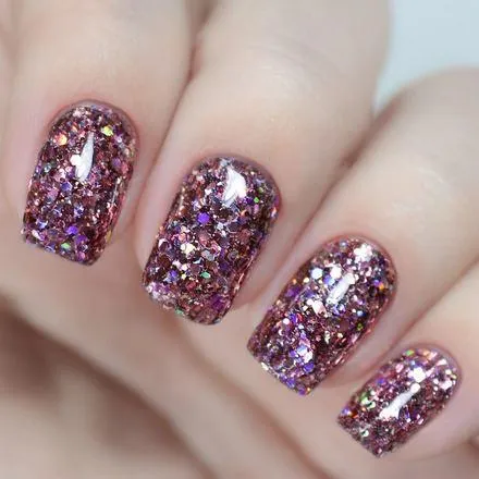 Первыми в списке средств, при помощи которых создается мерцающий эффект стоят глиттерные лаки. Они образованы из прозрачной базы и мелких частиц фольги. Их блеск регулируется количеством слоев. Если нужно больше блеска – делаем больше слоев.