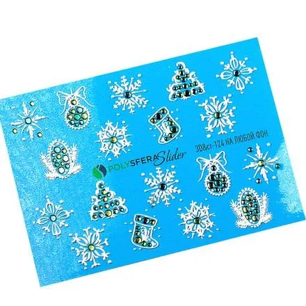 Слайдер представляет собой трехмерную наклейку на прозрачной пленке. Тебе нужно обрезать выбранную снежинку от листа, опустить в теплую воду на 10 секунд, а затем сдвинуть ее с пленки на ноготь, разровнять, просушить и запечатать топом.