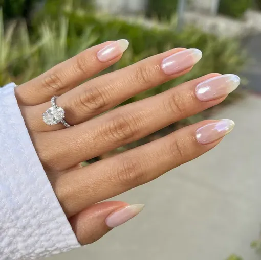 Это тот самый маникюр Золы Ганзоригт, который носили Хейли Бибер и другие звезды. Даже спустя год он остается одним из главных ногтевых трендов. Дизайн выглядит так, будто ты окунула ногти в прозрачную сладкую глазурь. Здорово, что повторить такой маникюр с перламутровым лаком можно и дома!