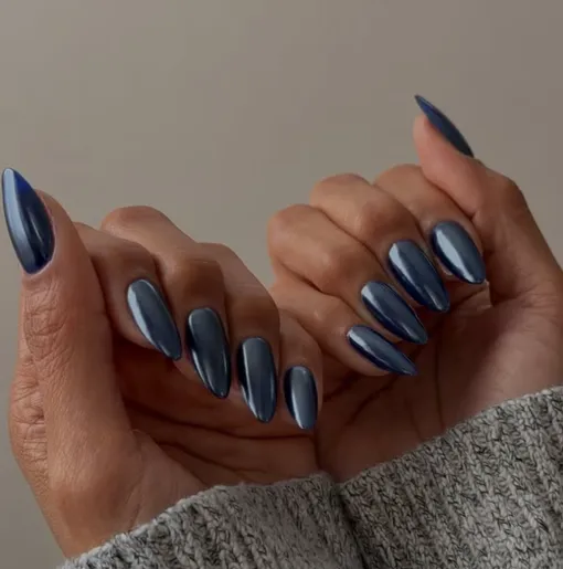 Такой маникюр смотрится свежо и необычно, но при этом остается универсальным. Подбери свой оттенок синего, чтобы наслаждаться прохладным мерцанием на ногтях все время до следующего визита к мастеру!