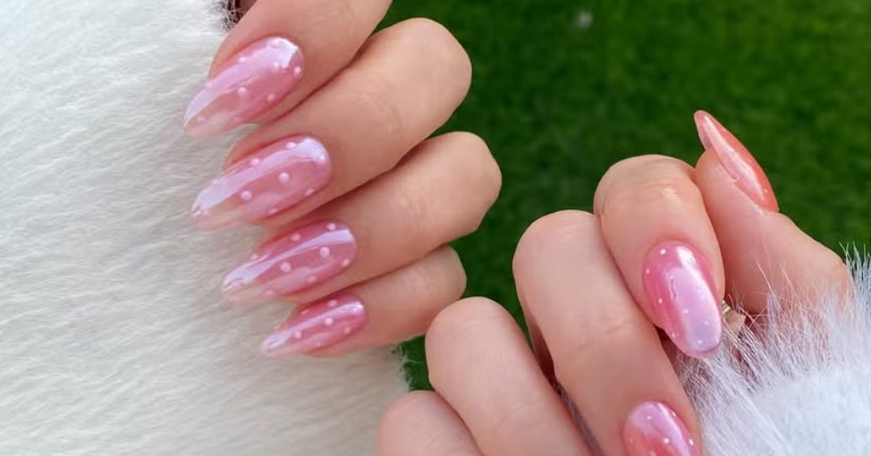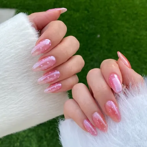 Горошек на ногтях уже почти год не уходит из соцсетей. Его носят и Дуа Липа, и Хейли Бибер! Если покрыть дизайн с горошком стеклянным хромом, почти прозрачным, то он станет настоящим воплощением глэм-шика.