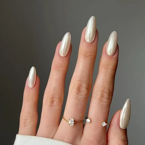 Ванильный хром — это, пожалуй, главный маникюр для поклонниц эстетики «чистая девушка». Чтобы получит такой эффект, нужно нанести на молочно-белую основу белый или серебристый хром. Дизайн получается одновременно и стеклянным, и кремовым — очень уютно и не вычурно.