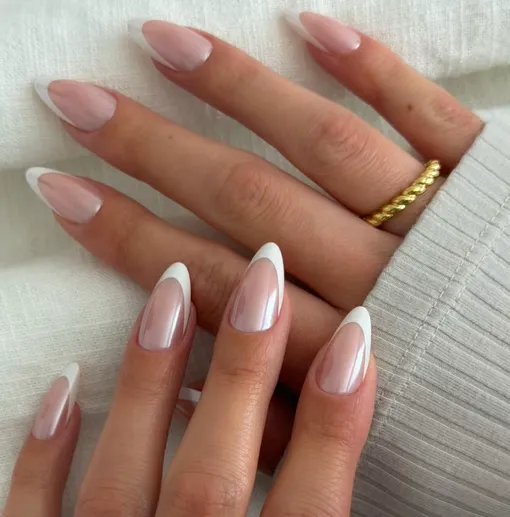 Классический французский маникюр — это база, которая редко разочаровывает. Если же добавить сверху прозрачный или белый хром, он сразу заиграет по-новому. Глянцевый слой делает кончики ногтей изящными и необычными, так что скучным дизайн точно не назовешь!