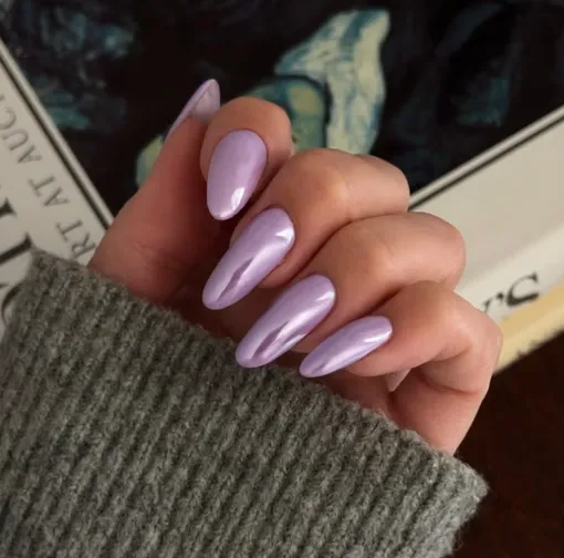 Это мой любимый маникюр с хромом — признаюсь, я просто без ума от лаванды на ногтях. Нежный сиреневый лак с мерцающим финишем словно специально был создан для весны и лета.