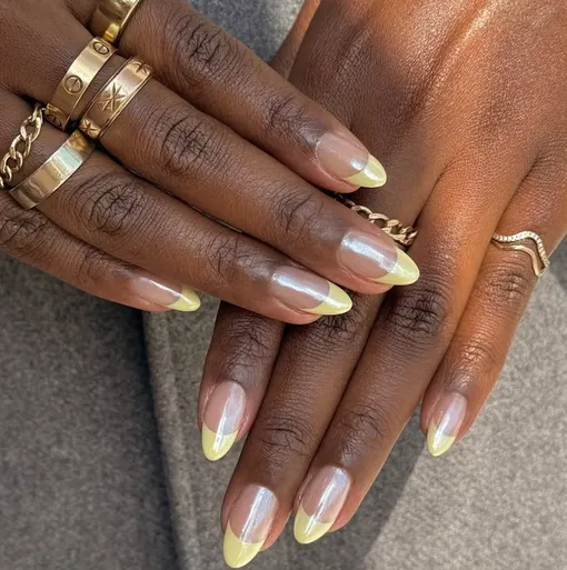Сливочно-желтый снова на пике популярности, и если покрыть его хромом, маникюр сразу будет выглядеть статусно и необычно. Хром смягчает яркость основного цвета, а глянцевый блеск делает его... маслянистее и аппетитней!