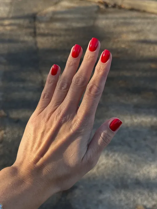 Квадратная форма придает красному изящность и делает его универсальным цвета для классического маникюра.
