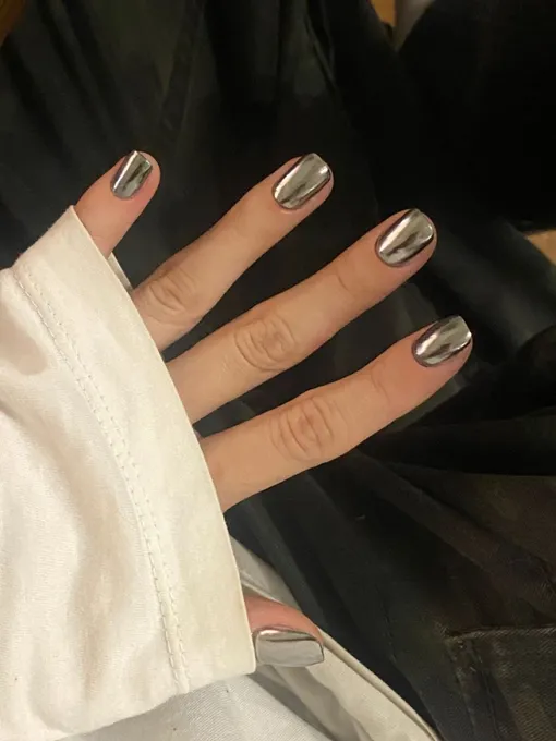 Зеркальный эффект и квадрат усиливают друг друга, создавая ощущение цельного, почти архитектурного дизайна. Маникюр выглядит как аксессуар, а не просто уход и покрытие.