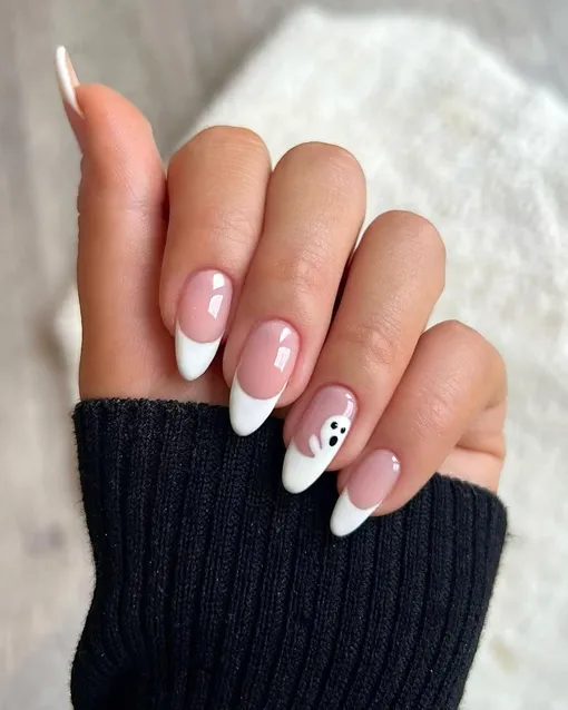 Здесь у нас лассический белый френч, но с забавным привидением на акцентном ногте. Минимализм и настроение Хэллоуина в одном флаконе. Если хочешь быть в тренде, но без излишеств, то этот вариант точно для тебя.