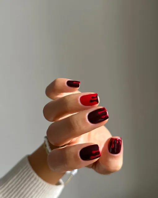 Бордовые ногти с каплями, будто только что из фильма про Дракулу. Такой маникюр добавит загадочности и страсти в твой образ, особенно в сочетании с чёрной помадой и костюмом вампирши на хэллоуинской вечеринке.