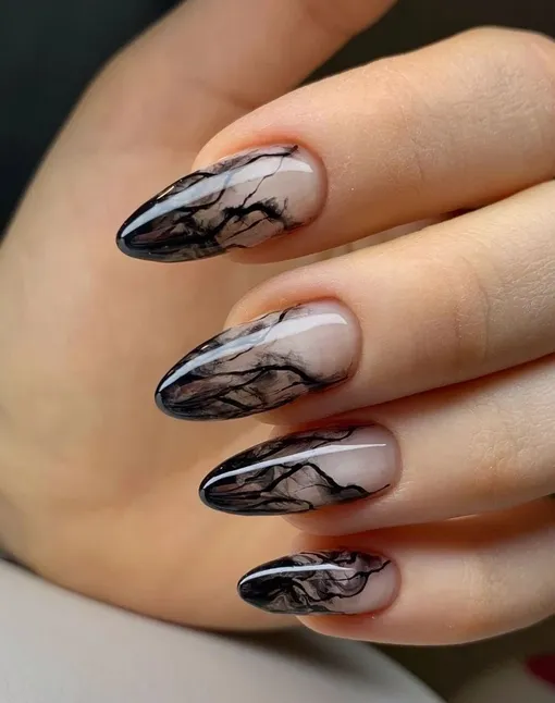 Если ты не фанат прямолинейных рисунков, попробуй абстракцию: дымчатый мрамор в черно-серых тонах выглядит загадочно и немного мистически. Такой маникюр будто скрывает в себе магию — идеален для ведьм в стиле минимализм.