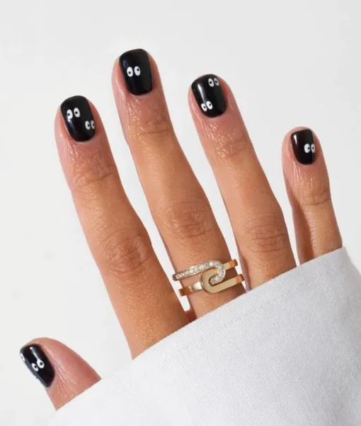 Минимализм с изюминкой — чёрная база и крошечные белые глазки, будто из тьмы кто-то наблюдает за тобой. Такой маникюр выглядит стильно и с долей иронии, особенно если ты не фанат страшных рисунков, но хочешь добавить немного хэллоуинского вайба в свою жизнь.