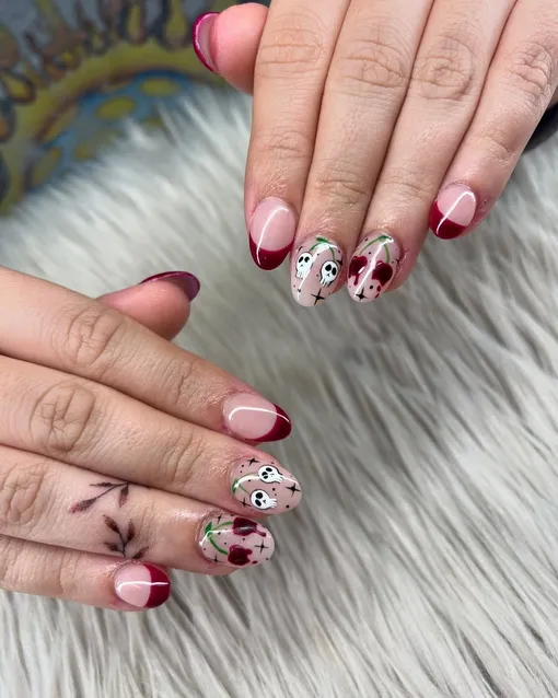 Немного готики, немного нежности — и получается маникюр для девушки, которая любит романтику с острыми углами. Миниатюрные черепа, бордовый френч и сердечки — все еще жутенько, но безумно мило.