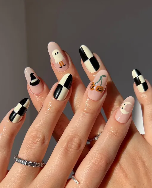 Кошки, луны, звезды и призрак — все, что нужно для хэллоуинской ночи. Этот дизайн — настоящий мультфильм на ногтях. Он передает атмосферу праздника, но остается носибельным и даже модным, особенно на короткой длине.