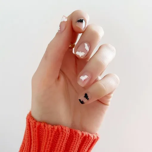 Белые и черные силуэты мышей на прозрачной базе смотрятся лаконично и забавно. Выглядит, как маникюр для девушки, у которой на полке свечи и книги про вампиров. И да, он отлично подойдет под любой образ, от кардигана до ведьминого плаща.