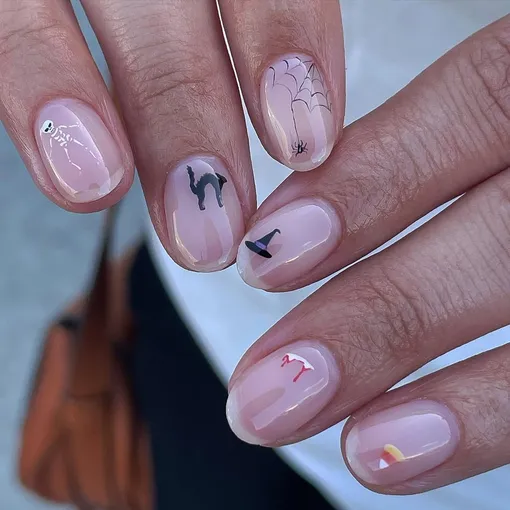 Паутина, кот, ведьмина шляпа и скелетик — будто маленькие татуировки на ногтях. Нюдовая база делает рисунки утонченными, а не детскими. Маникюр для тех, кто любит детали и считает, что ведьма — это профессия, а не образ.