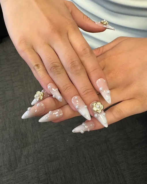 Хэллоуин, но во дворце фей: острые ногти, словно из сказки о снежной ведьме, украшены жемчужинами и объемными цветами. Маникюр для тех, кто верит, что даже ведьма может быть принцессой.