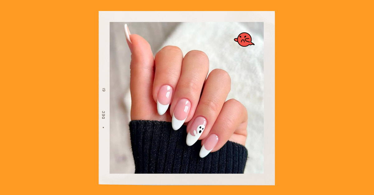 Здесь у нас лассический белый френч, но с забавным привидением на акцентном ногте. Минимализм и настроение Хэллоуина в одном флаконе. Если хочешь быть в тренде, но без излишеств, то этот вариант точно для тебя.