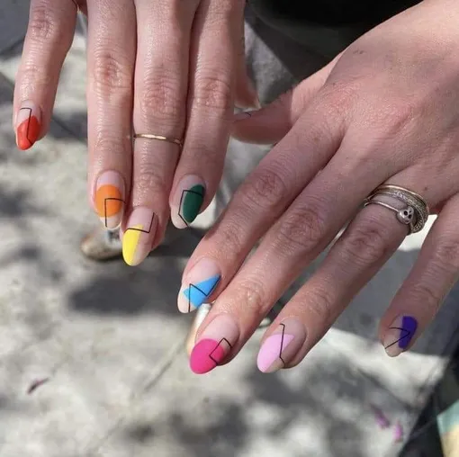 Абстрактные фигуры и блоки ярких оттенков — стильный привет эпохе постеров и мебели в стиле «Мемфис». Этот маникюр создает настроение эксперимента и свободы. А еще он идеально сочетается с однотонными теплыми свитерами осенью.