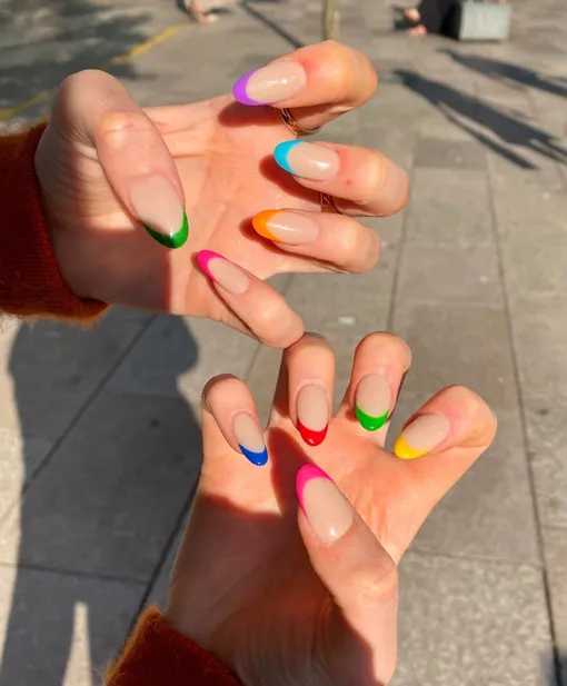 Французский маникюр с разноцветными кончиками — это как диско-шар на ногтях. Сочетание ярких оттенков напоминает огни танцпола. Такой дизайн особенно хорош для тех, кто любит нейтральную базу, но не против добавить цвета в детали. И, несмотря на яркость, такой дизайн подойдет под любой гардероб.