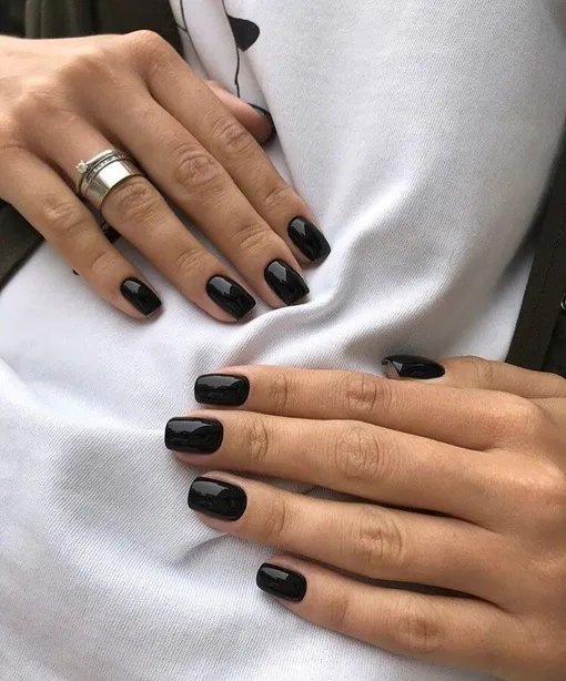 Простота, доведенная до идеала: глянцевый черный лак напоминает культовые виниловые пластинки. В осеннем свете он смотрится особенно драматично и добавляет образу уверенности. Такой маникюр — вечная классика диско, которая работает и в клубе, и на деловой встрече.