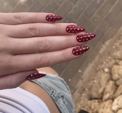 Глубокий бордово-кофейный фон делает основу стильной и насыщенной, а белые горошки добавляют игривости и делают маникюр менее строгим.