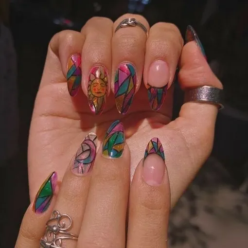 Яркие сегменты напоминают настоящие витражные окна, а солнышко на среднем пальце добавляет сюжета. Маникюр получился и смелым, и игривым — неординарный выбор для тех, кто хочет максимум цвета. Уровень сложности — высокий: здесь важна не только техника, но и чувство композиции.