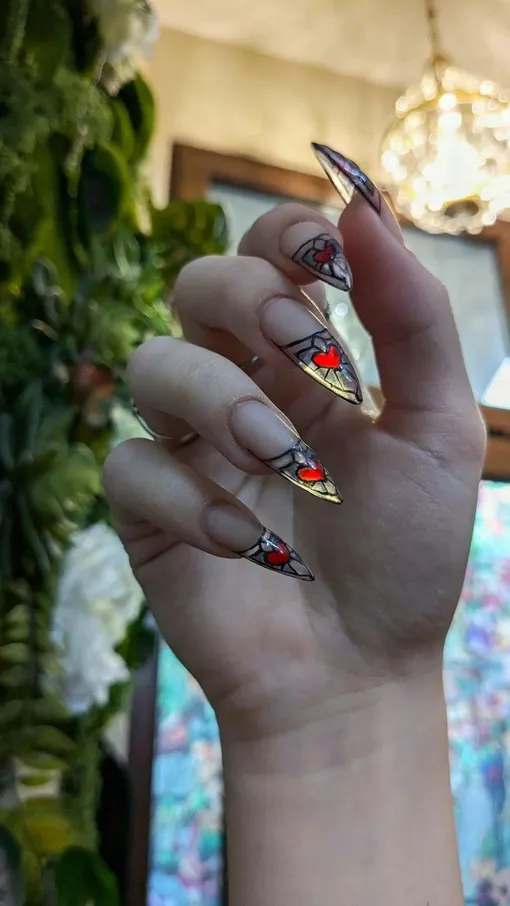 Матовое основание и чёткие, будто нарисованные чернилами контуры. В центре прорисованы яркие красные сердца, подсвеченные светом в стиле готических окон. Такой маникюр сложно не заметить: он требует и характера, и уверенности в себе. Уровень исполнения — топ, дизайн — почти арт-объект.