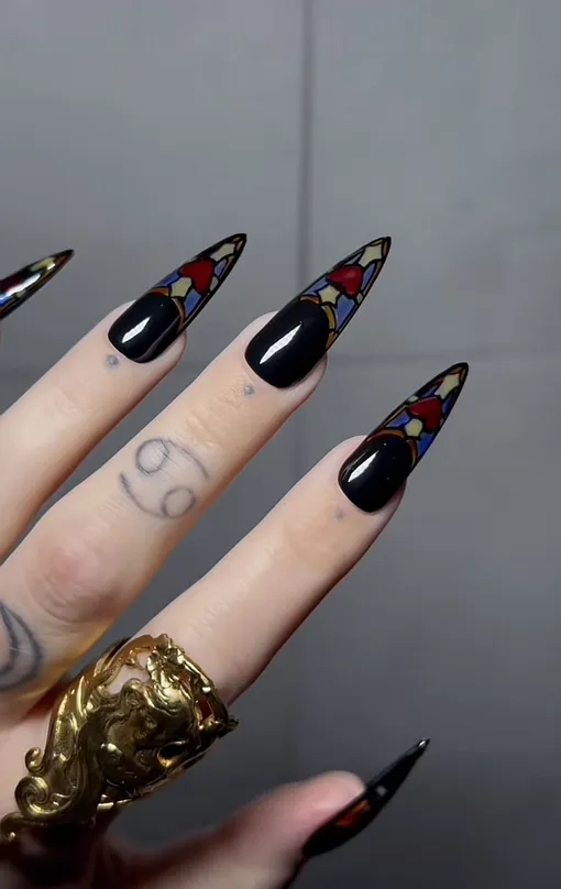 Это как французский маникюр, но для готической принцессы: основа — плотный черный лак, а на кончиках — насыщенные цвета и острые углы в стиле витражей. Эффект достигается выразительный, почти театральный. С такими ногтями ты точно не останешься без внимания окружающих.