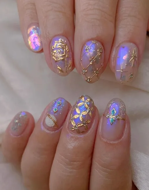 Каждый ноготь как украшение: прозрачная база с голографическим переливом будто подсвечена изнутри. Сверху — объемные золотые элементы, от роз до крест-накрест пересеченных линий. Такой дизайн эффектный и капризный в исполнении, потому требует идеального баланса деталей и уверенной руки мастера.