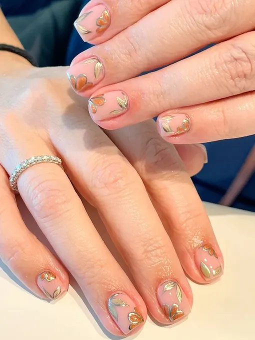 Простые формы, деликатная палитра и лаконичные рисунки. Серебристые листочки и бронзовые лепестки будто выложены тонкой кистью по прозрачной базе. Идеальный вариант для тех, кто хочет добавить флористики, но без излишнего декора — аккуратно, минималистично и очень по-летнему.