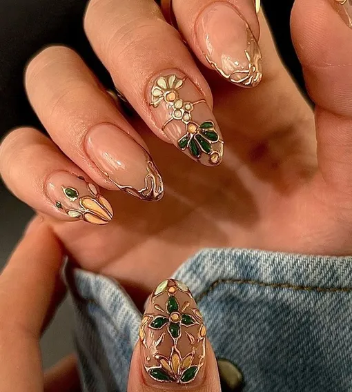 Френчи с витражными лепестками смотрятся свежо, и необязательно делать их мрачными, как в предыдущих вариантах. Оттенки зеленого и синего красиво сочетаются с телесной базой, а тонкие металлические линии придают всей работе изящество и «дорогой» вид. Это маникюр, который не надоедает: он и геометричный, и женственный одновременно.