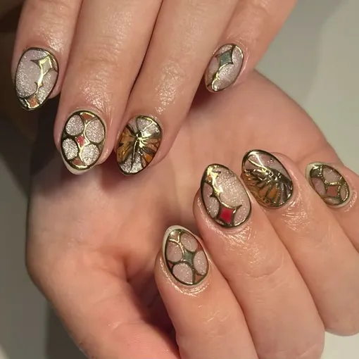 Маникюр, который будто собран из драгоценных камней: светлый блестящий фон и сложные узоры в золотой оправе. Фрагменты выполнены с разной формой и глубиной цвета, создавая эффект то ли яиц Фаберже, то ли все тех же витражей. Впечатляет детализацией — это точно не экспресс-маникюр за 30 минут.