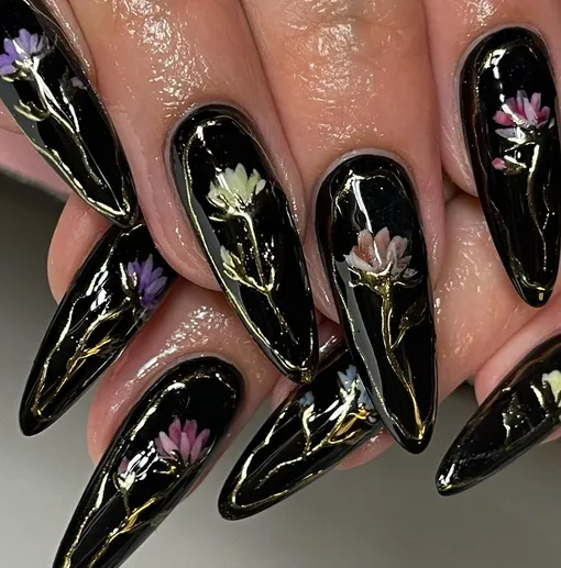 Глянцевая черная база делает ногти похожими на эмаль, а веточки с миниатюрными цветами будто нанесены кистью ювелира. Этот дизайн выглядит невероятно элегантно — идеальный баланс между драмой и изяществом. Сделать его дома практически нереально: нужна не только техника, но и художественный глаз.