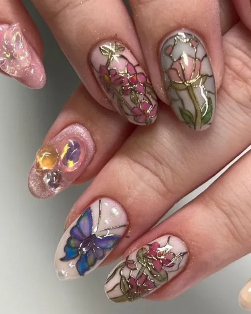 Здесь сочетается все и сразу — и прозрачный объем с капельками геля, и сложная роспись по типу витража. Каждый ноготь как маленькое полотно: бабочки, цветы, золото, детали. Несмотря на насыщенность, композиция смотрится уравновешенно и в тему.