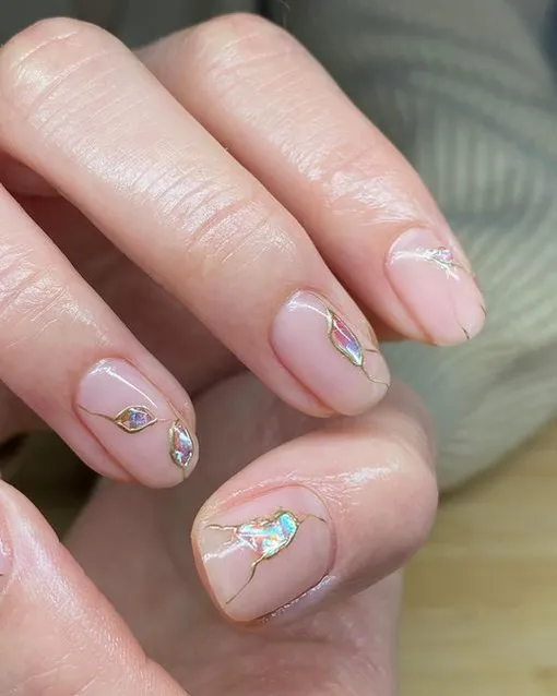 Полупрозрачная база и почти незаметный золотой контур, обрамляющий переливающиеся «осколки». Дизайн ощущается как маникюр с секретом: простая форма, но каждая деталь сделана предельно аккуратно. Чистая эстетика японского подхода к минимализму, которая актуальна не первый сезон.