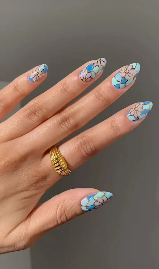 Этот вариант похож на витраж или мозаику с цветочными мотивами: нежные голубые, сиреневые и мятные оттенки собираются в форму лепестков, обведенных тонкими золотыми линиями. Все это выполнено на миндалевидной форме, что придает маникюру особенно «дорогое» настроение.