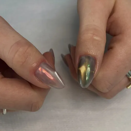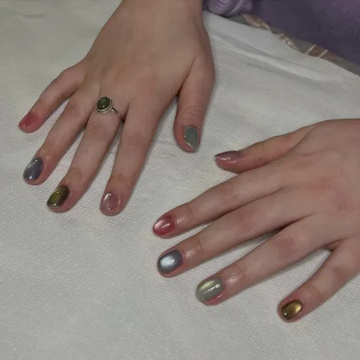 Лови минималистичную версию тренда: тут мы видим короткие ногти с разными оттенками «кошачьего глаза», которые создают мягкий космический перелив и выглядят особенно интересно при движении рук.