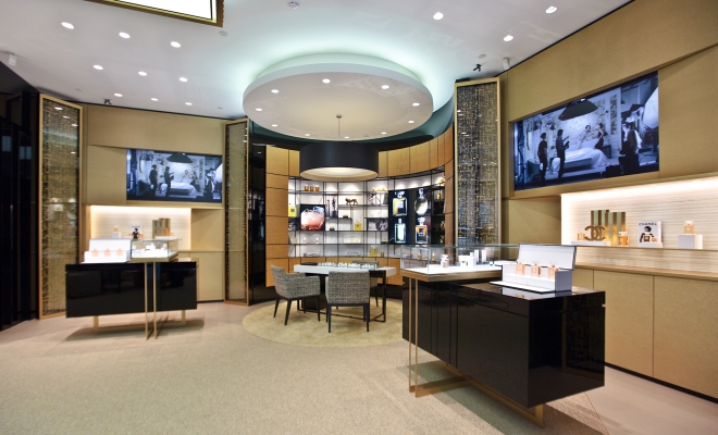 Здесь живет красота — первое ощущение, которое возникает, когда ты переступаешь порог бьюти-бутика Chanel, расположившегося в здании гостиницы «Москва». Интерьер магазина выполнен в традиционных оттенках легендарного Дома: золотом, черном и бежевом. Мебель обита светлым твидом, пол выполнен из мрамора, а стеллажи — из эксклюзивных стекла и зеркала.