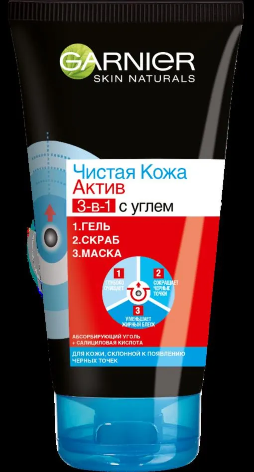 «Чистая Кожа Актив 3-в-1» с углем против черных точек. Благодаря салициловой кислоте оказывает антибактериальное действие, интенсивно очищает кожу от загрязнений. Микрочастицы натурального эксфолианта эффективно помогают бороться с закупоренными порами и черными точками. А уголь и экстракт черники заметно уменьшают жирный блеск, оставляя ощущение комфорта на коже.