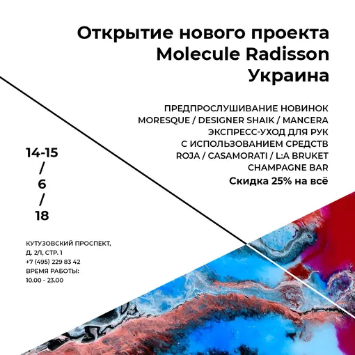 14 и 15 июня (четверг, пятница) состоится открытие нового проекта Molecule в гостинице Radisson Украина. В честь этого знаменательного события гостей ждут: