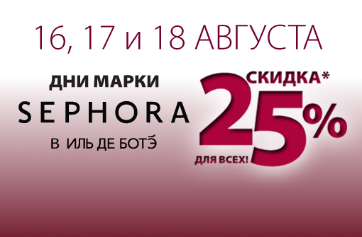 ...с 16 по 18 августа стартуют дни марки Sephora. Всем покупательницам будет предоставлена скидка 25% на товары марки Sephorа (за исключением тех, которые отмечены зелеными и желтыми ценниками, — будь внимательна!) Так что у тебя есть удивительный шанс познакомиться с брендом или приобрести уже полюбившуюся косметику.