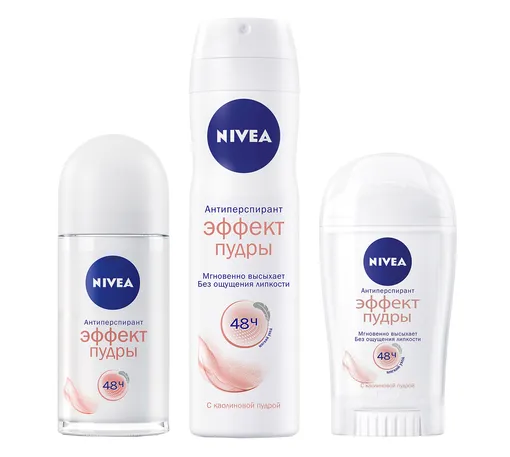 «Эффект пудры» от NIVEA представлен на российском рынке в трёх видах – ролик, спрей и стик.
