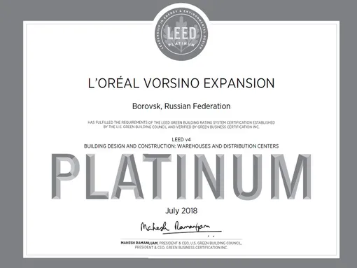 Новая часть завода L'Oréal на территории индустриального парка Ворсино успешно прошла процедуру оценки по самой жесткой системе сертификации экологического и энергоэффективного строительства зданий в мире LEED четвертого уровня, набрав 80 баллов из возможных 110, и получила сертификат LEED v4 уровня Platinum от Американского совета по зеленому строительству. Это наивысший уровень оценки, подтверждающий применение самых эффективных и экологичных методов проектирования и строительства, а также приверженность компании принципам устойчивого развития.