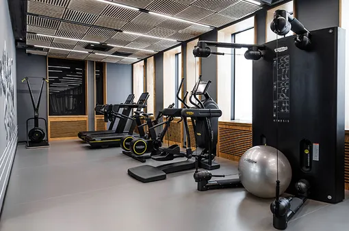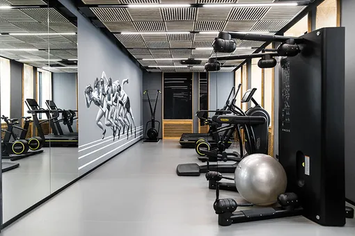 Внутри студии царит так называемый «эко-люкс» — сосновая фанера вперемешку с графитом и черным создают очень современный, но очень уютный облик. Настроение спорта передают граффити на стенах, изображающие советских спортсменов в стиле Дайнеки. Отдельно стоит упомянуть тренажеры Technogym: они являются самыми инновационными, современными и умными рабочими «лошадками» на рынке.