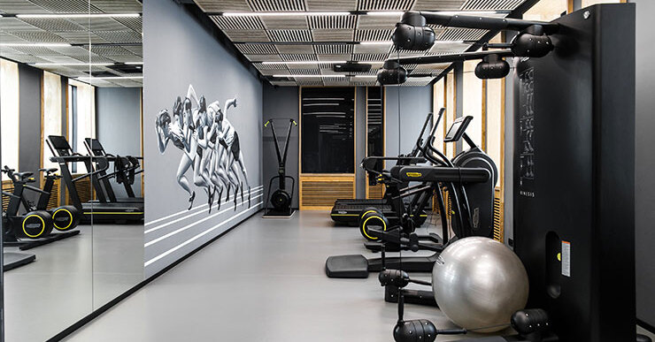 Внутри студии царит так называемый «эко-люкс» — сосновая фанера вперемешку с графитом и черным создают очень современный, но очень уютный облик. Настроение спорта передают граффити на стенах, изображающие советских спортсменов в стиле Дайнеки. Отдельно стоит упомянуть тренажеры Technogym: они являются самыми инновационными, современными и умными рабочими «лошадками» на рынке.