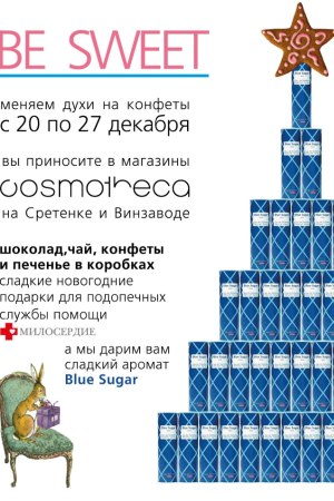 С 20 по 27 декабря приходи в один из магазинов на Сретенке (Сретенский б-р, 2) или Винзаводе (4-й Сыромятнический пер., 1, стр. 6) и принеси с собой красивую коробку конфет или печенья. В ответ ты получишь сахарный аромат Blue Sugar.
