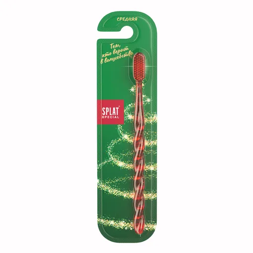 Мерцающая зубная щетка SPLAT Special — это лимитированная новогодняя коллекция, созданная специально для тех, кто верит в волшебство. Щетка SPLAT Special с ионами серебра специально создана для бережного ухода и эффективной чистки зубов. 2 500 прорезиненных щетинок с закруглением кончиков очищают поверхность зубов от налета на 40% эффективнее обычной щетины, способствуя осветлению эмали до натурального оттенка и эффективно удаляя налет от чая и кофе. Благодаря продуманной форме и оптимальной жесткости щетка подходит для ежедневного использования и помогает поддерживать гигиену полости рта и здоровье десен. Для наилучшего эффекта используй вместе с мерцающей зубной пастой SPLAT Special с блестками — так ты добьешься максимальной чистоты и сияния твоих зубов каждый день.