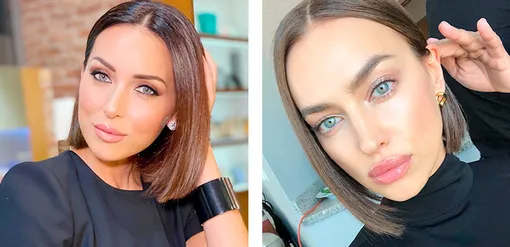 Что будет, если оставить тщательный макияж, но решиться на графичное каре? Неминуемое сходство с топ-моделью Ириной Шейк. Знаменитостей объединяет не только стрижка, но и цвет и миндалевидный разрез глаз. Правда, акценты в макияже звезд совершенно разные: Ирина подчеркивает лишь губы, используя нежный ягодный блеск и чуть заходя за контур, а вот Алсу добавляет акцент в виде подводки, которая делает взгляд «кошачьим».