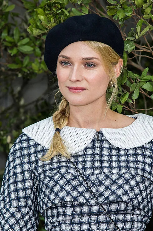 Для обладательниц средних и длинных волос подойдет вариант прически, как у Дианы Крюгер. Заплети небрежную косичку, вытащи пару прядей у лица и надень берет или шапку. Отличный быстрый вариант прически, которая получится у всех с первого раза.